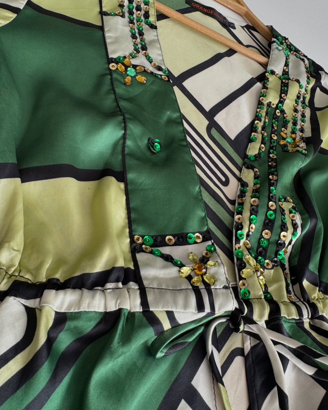 بلوز رویه ساتن ابريشم خيلي خاص و خوشگل پولک و سنگدوزی شده برند orange house مناسب سايز ٤٠/٤٢ عرض سينه٥٣ قد٦٧٦٩ عرض بازو ٢٠