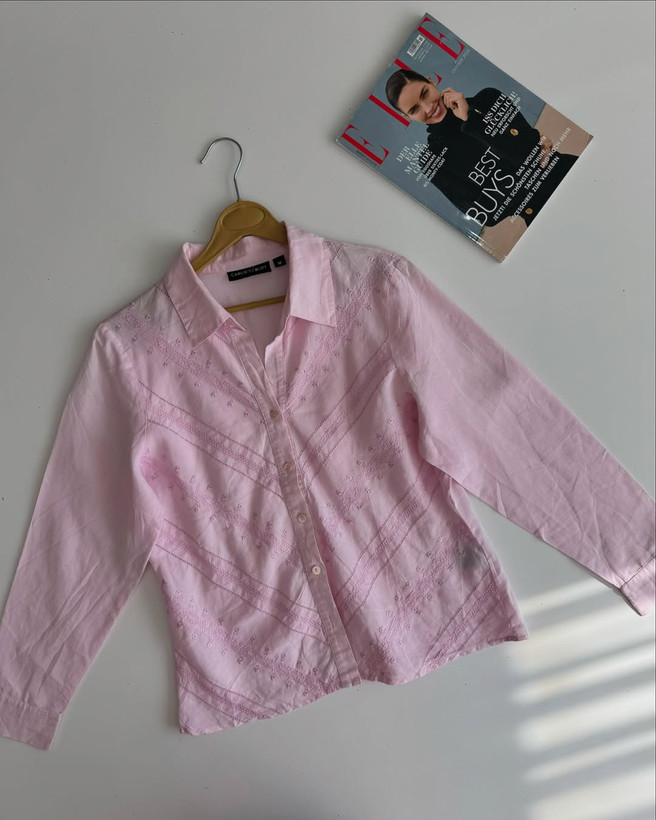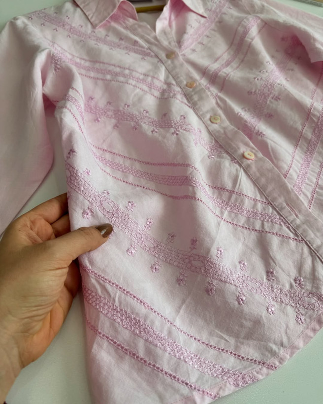 خيلي كار خاص و نازيه شوميز١٠٠٪لينن گلدوزي شده خيلي شيك و خوشگل برندcarlies court سايز روي كار مديوم اما تاسايز٤٤اوكي عرض سينه٥٧ عرض بازو١٩ قد٦٦