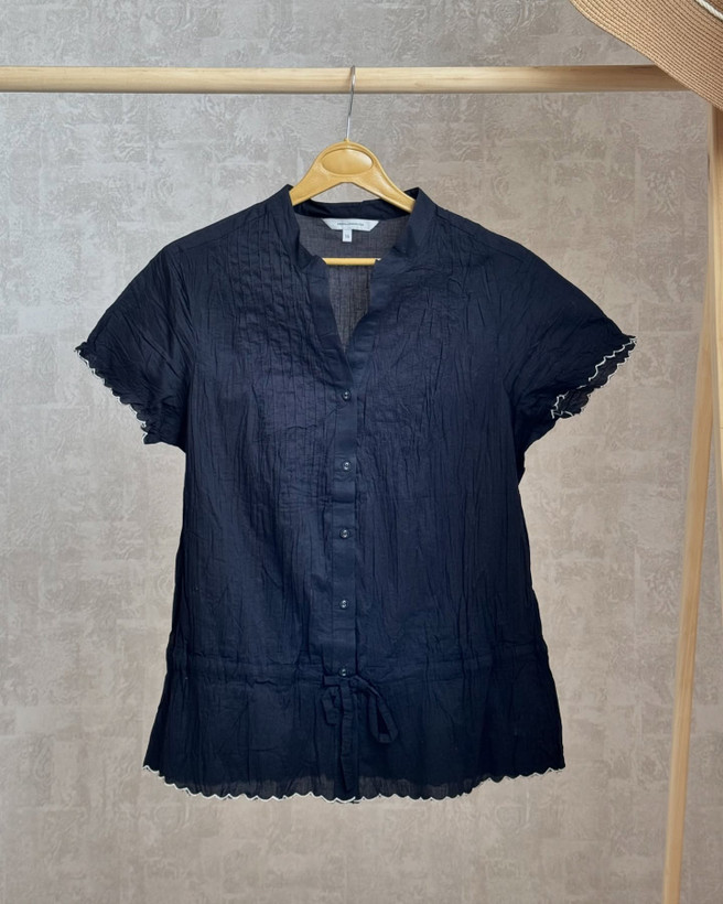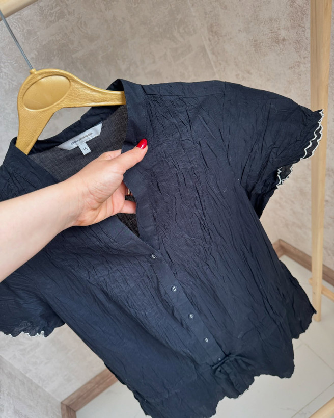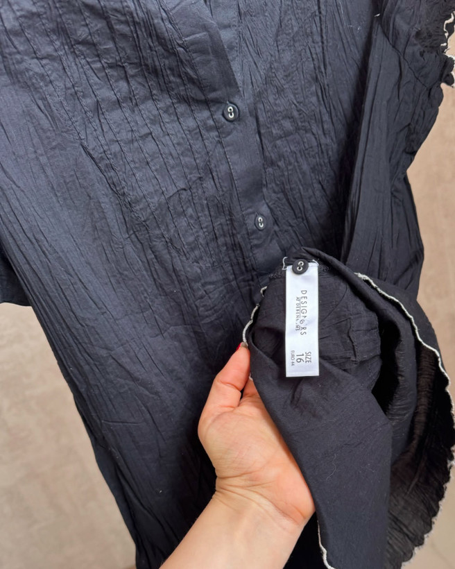 شومیز مشکی ۱۰۰٪کتان خیلییی با کیفیت وخوشگل از نزدیک بینهایت زیباستاصلا دیدنداره و سایه نمیندازه برند انگلیسیjohn rocha سایز روی کار ۱۶ مناسب سایز ۴۰تا۴۴ عرض سینه از۵۱تا۵۴اوکی قد۶۹