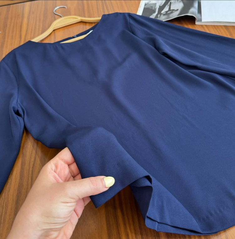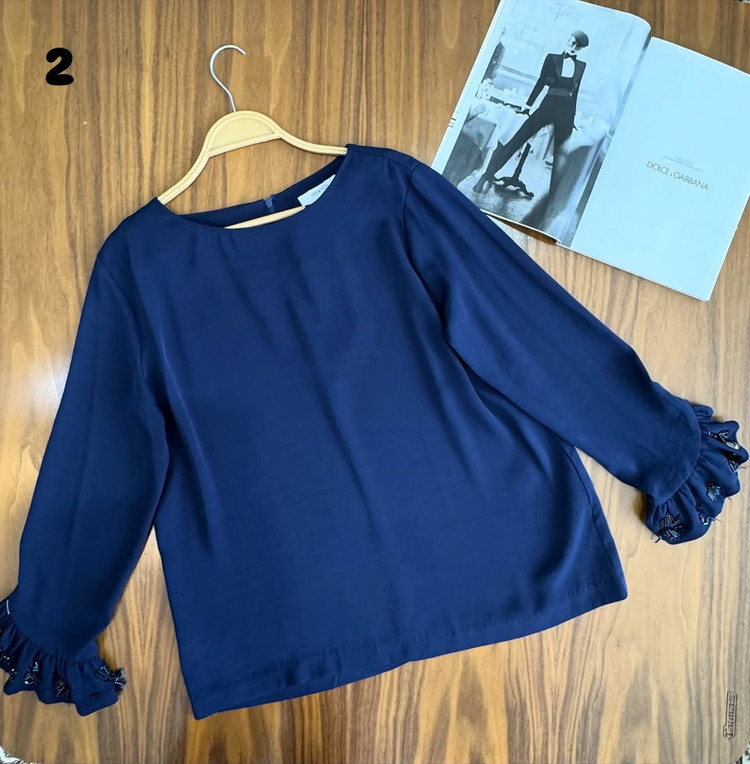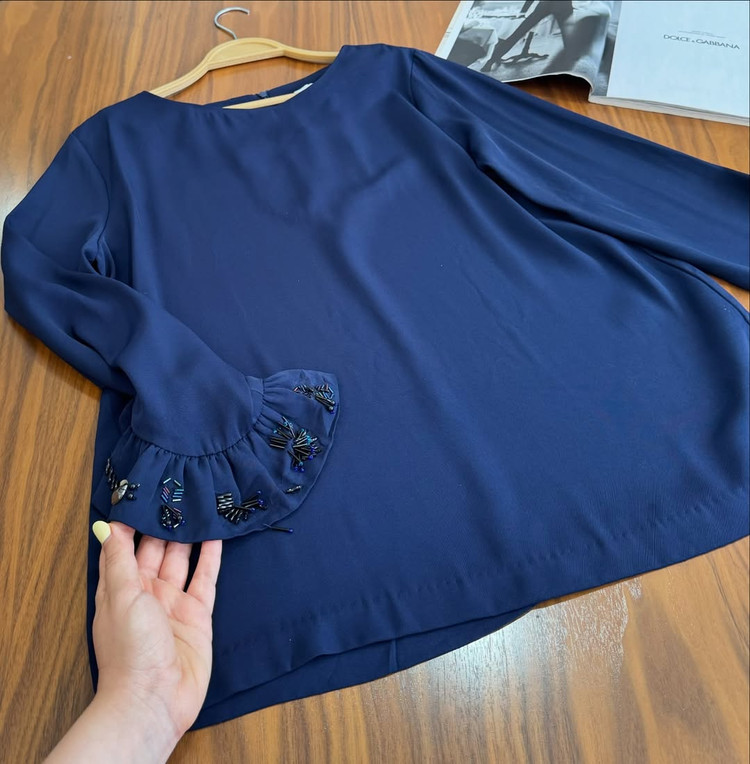 بلوز سرمه ای رنگ کرپ مجلسیسر استینا کار شده با ملیله و سنگ كه تو بار ريزش داشتهپشت کار زیپداره برند محشرipekyol مناسب سايز٤٢٤٤ عرض سينه٥٥ عرض بازو١٧ قد٧٠ قيمت٦٥٠ ——————————