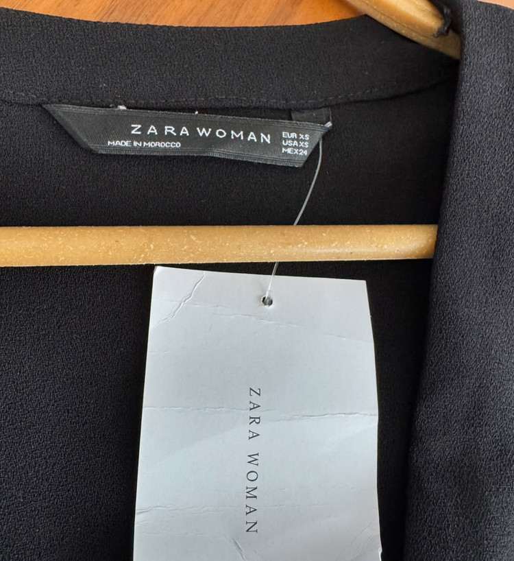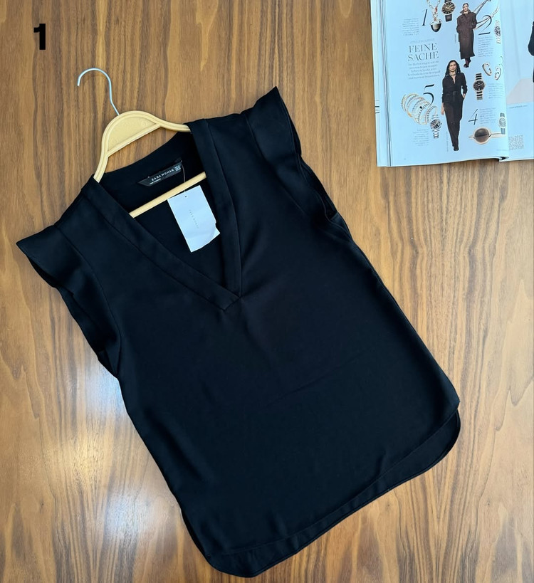 بلوز تمام مشكي جنس عالي و بينظير تگدار برندzara سايز روی کار ایکس اسمال مناسب سایز۳۴تا۳۸ عرض سینه۴۶ قدجلو۶۲پشت۶۶ روی تگ ۲۵یورو(۲میلیون و۶۵۰) قیمت۶۲۵