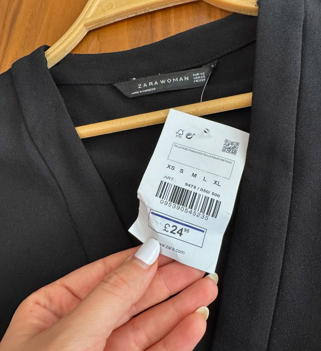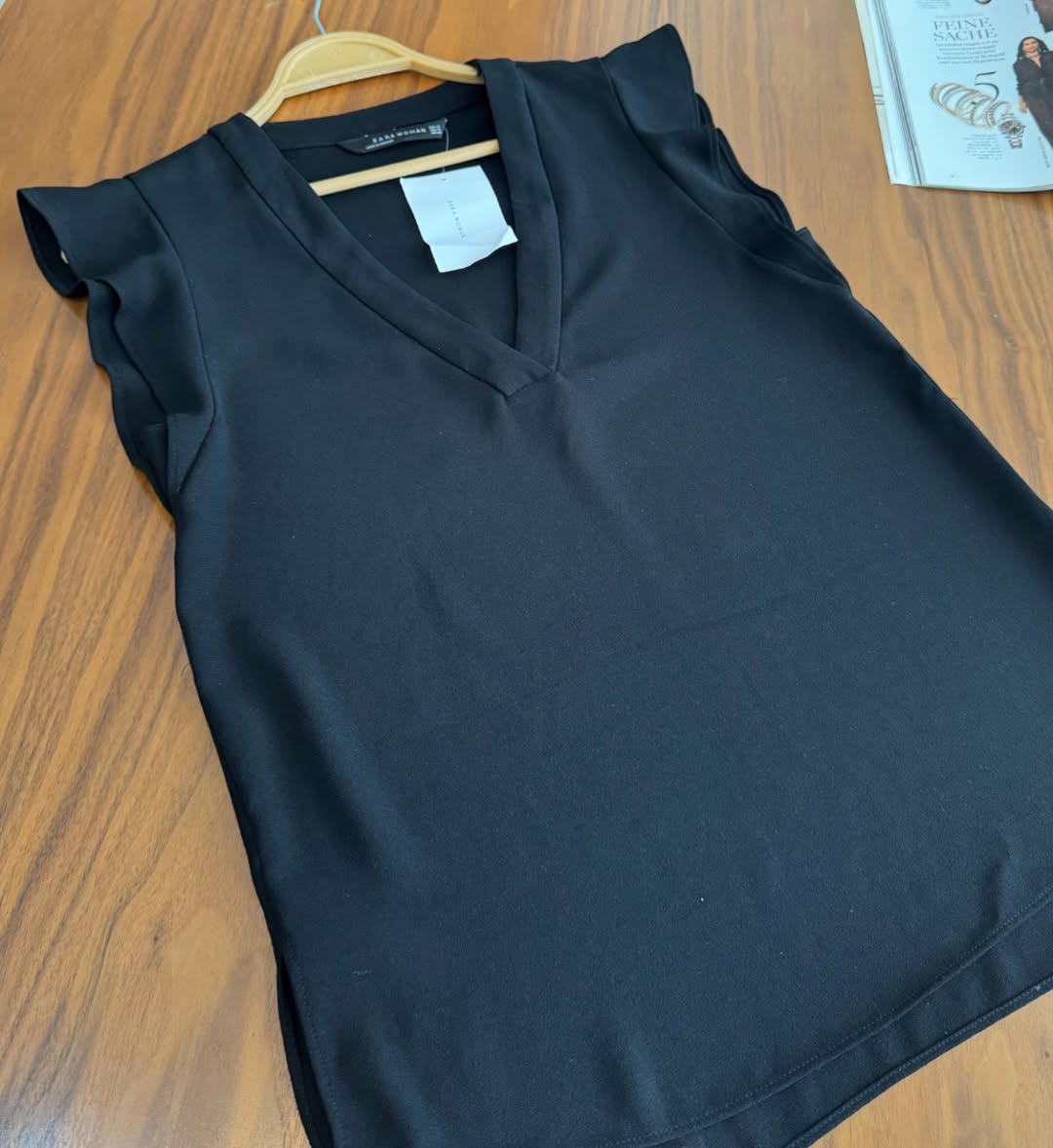 بلوز تمام مشكي جنس عالي و بينظير تگدار برندzara سايز روی کار ایکس اسمال مناسب سایز۳۴تا۳۸ عرض سینه۴۶ قدجلو۶۲پشت۶۶ روی تگ ۲۵یورو(۲میلیون و۶۵۰) قیمت۶۲۵