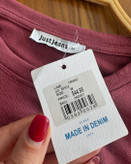 بلوز بافت لطيف و خيلي خوشرنگ و خاص و ناز تگدار برند Just Jeans. مناسب برای سایز ۴۲ تا ۴۶ عرض سینه در حالت عادی ۵۵ تا ۷۰ کشسانی دارد و عرض بازو ۱۸ تا ۲۲ کشسانی دارد و قد ۶۷.